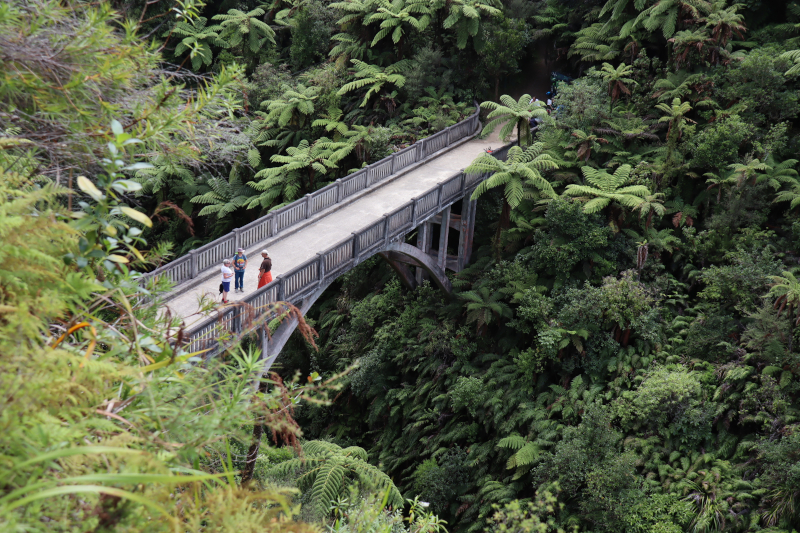 Das Ende der Flußfahrt bildete ein 40 minütiger Bushwalk zur Bridge to Nowhere. Diese Steinbrücke ist schweinbar nur für einen Wanderweg über einen kleinen Fluß (Mangapurua Stream, einenm Seitenarm des Whanganui) aus dem Bush kommend und in den Bush weitergehend, gebaut. Die eigentliche Geschichte der Brücke, hängt jedoch mit der Geschichte der Siedler dieses Gebietes zusammen. So lebten in dieser Gegend 40 Familien, die ihre Schafwolle zum Whanganui bringen mußten, um diese später in die Stadt Whanganui zum Verkauf zu verschiffen. Als die Brücke ca. 1930 fertig war, lebten nur noch 3 der ursprünglich 40 Familien in dieser Gegend, die die Brücke nutzten. Heute wird der Wanderweg ebenfalls als MTB-Strecke genutzt.
