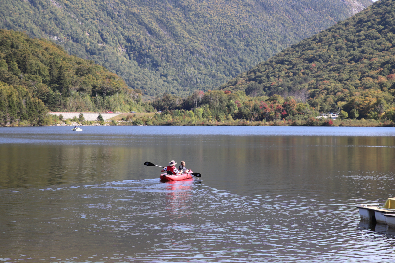 Um dem ganzen schottischen Gewusel dann doch noch zu entfliehen, fuhren wir durch Franconia Notch (Notch = Tal) zum Echo Lake, um dort endlich unser rotes Paddelboot aufzubauen und gemeinsam mit diesem und einem zusätzlich gemieteten Kanu auf dem See unterwegs zu sein.